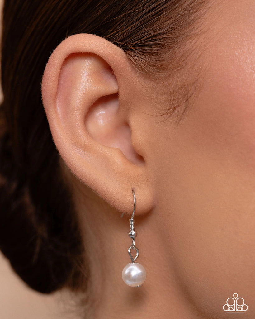 Pressed in a silver fitting, a solitaire glossy white pearl gives way to a vintage-inspired silver pendant embellished with additional white pearls in varying sizes and cuts, white rhinestones, silver rose detailing, and silver studs. The overly opulent pendant sways from an abstract silver chain, sporadically sprinkled with further dainty, white pearls, creating a Gatsby-inspired display below the neckline. Features an adjustable clasp closure.